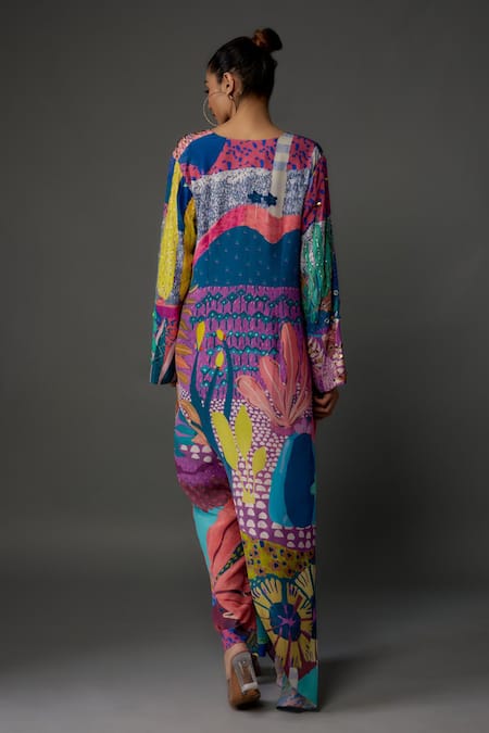 Metallic embroidered highlights, Fringed details, All-over multi-colored print