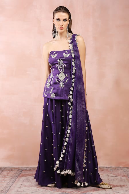 Purple satin off-shoulder kurta featuring intricate bird and vintage patterns with gold gota, zari, resham, and bead embroidery. Paired with a silkmul flared sharara adorned with mirror work and a lurex georgette dupatta with a fringe tasselled border.