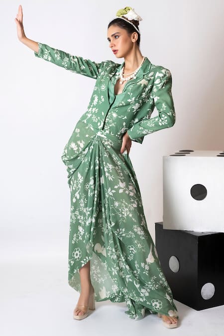 Green floral pattern waistcoat featuring full sleeves and an open neckline. Paired with a draped skirt that has a button closure.