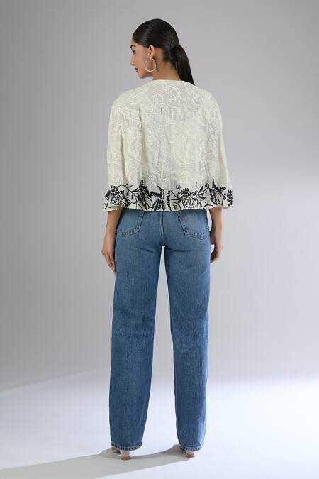 Off White Embroidery Dori Band Collar Floral Poncho Top