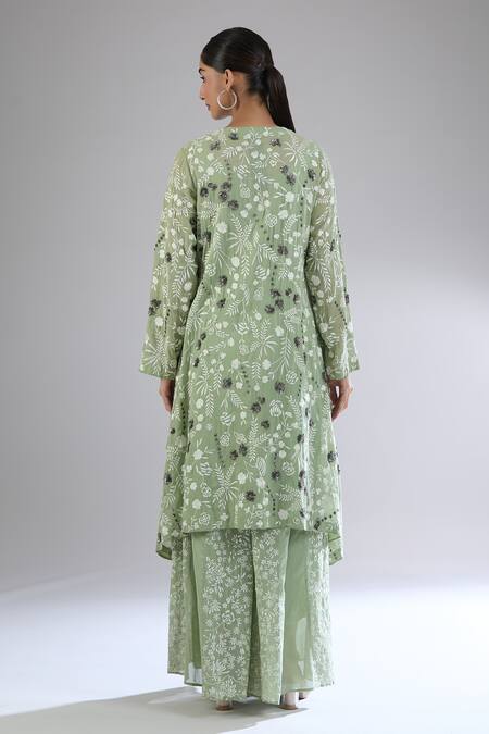 Green Moss Embroidery Resham Round Neck Floral Tunic Set