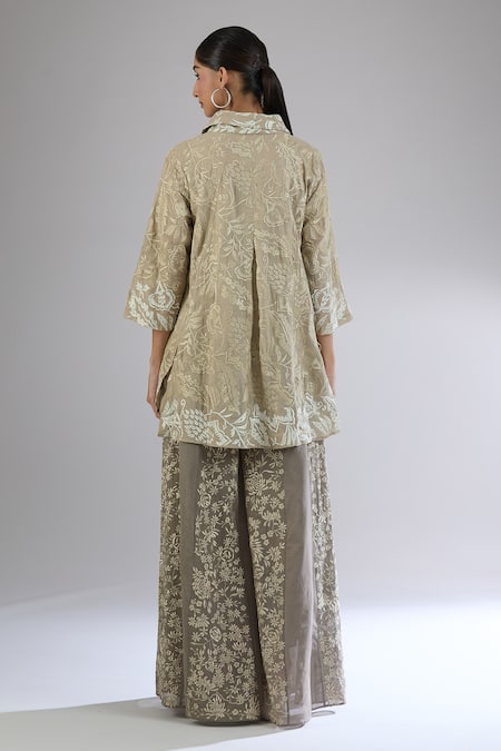 Brown jacket featuring resham embroidery in floral patterns. Paired with a slip underneath.