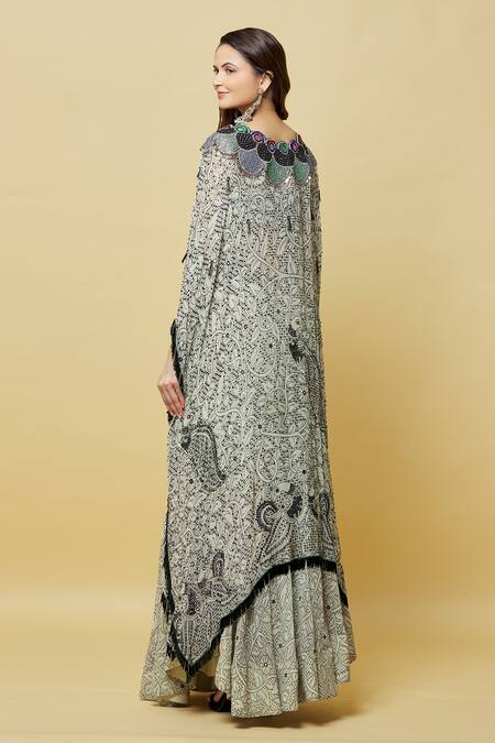Off white kaftan jacket featuring all-over peacock and floral print with embroidered border. Paired with a scallop embroidered blouse and circular pant.