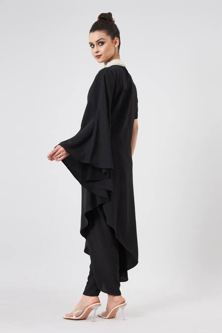 Black asymmetrical kurta in moss crepe featuring embroidered pearl neckline. Paired with a plain draped pant for a complete look.