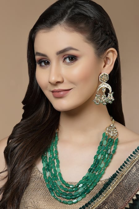 Clustered pearl drops, Green bead accents, Kundan embellishments
