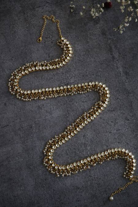 Gold plated waist belt featuring intricate kundan and pearl embellishments