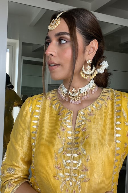 Gold choker featuring semi-precious polki and pearl layered detailing