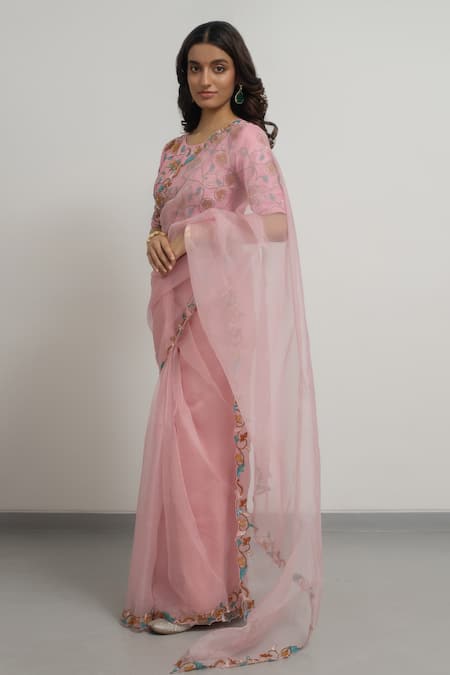 Blush pink silk organza saree featuring floral and sequins hand embroidered borders. Paired with a matching blouse with round neckline and half sleeves.