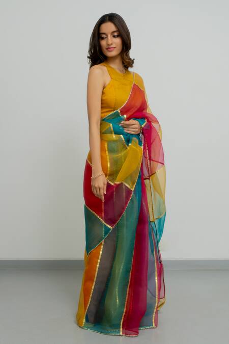 Multi-colored silk organza saree featuring gota embroidered lines. Paired with a pleated blouse.