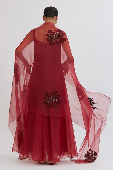 Maroon straight silhouette kurta in silk base fabric, paired with an organza flared sharara. Comes with embroidered dupatta with sequins, threads & beads.