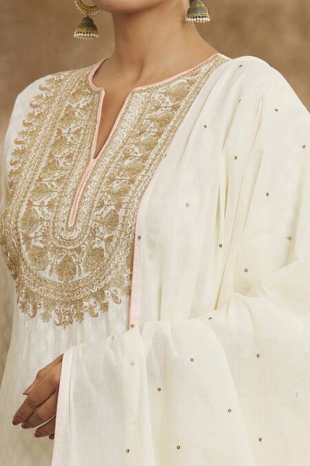 Off-white cotton kurta featuring aari embroidery and notched neckline. Paired with coordinating pant and dupatta, both in matching off-white fabric.