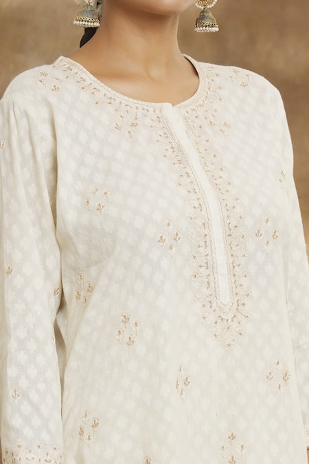 Off White Cotton Embroidery Round Neck Aari Kurta Pant Set