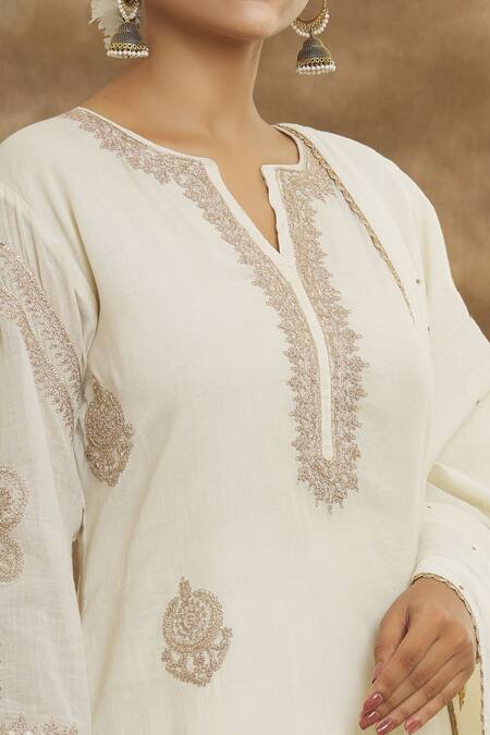 Off-white cotton kurta featuring aari embroidery and side slits. Paired with matching pant and dupatta.