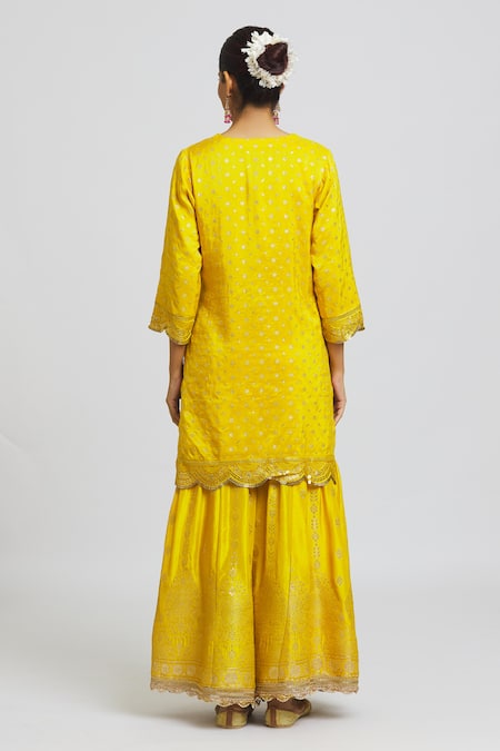 Yellow Silk, Organza Sequins, Embroidery Round Banarasi Kurta Sharara Set