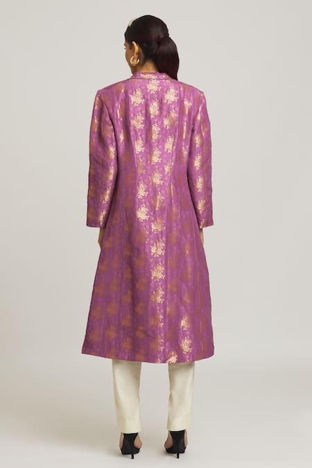 Purple embroidered long blazer coat featuring a lapel collar and long sleeves