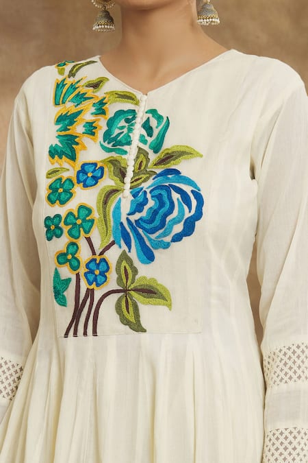 Cream anarkali featuring floral embroidery on the yoke and lace patch work