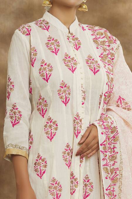 Cream kurta featuring all-over floral block print with a potli button placket and slit detailing. Paired with matching pants and a dupatta.