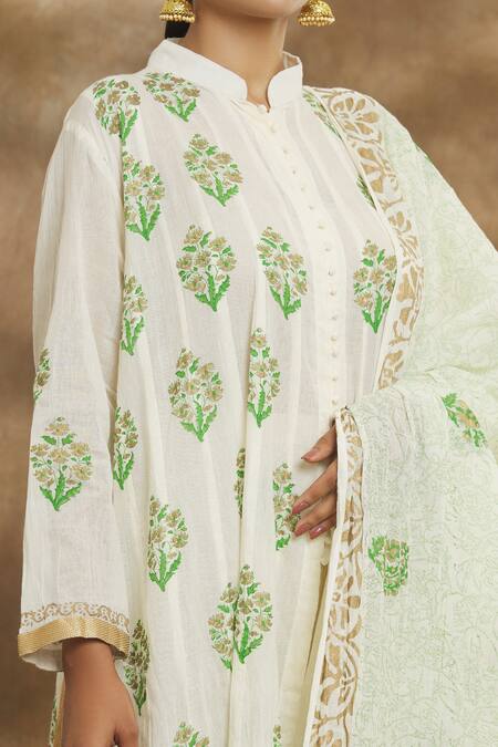 Cream kurta featuring an all-over floral block print with a band collar and full sleeves. Paired with matching pants and a dupatta, it includes a potli button placket and slit detailing.