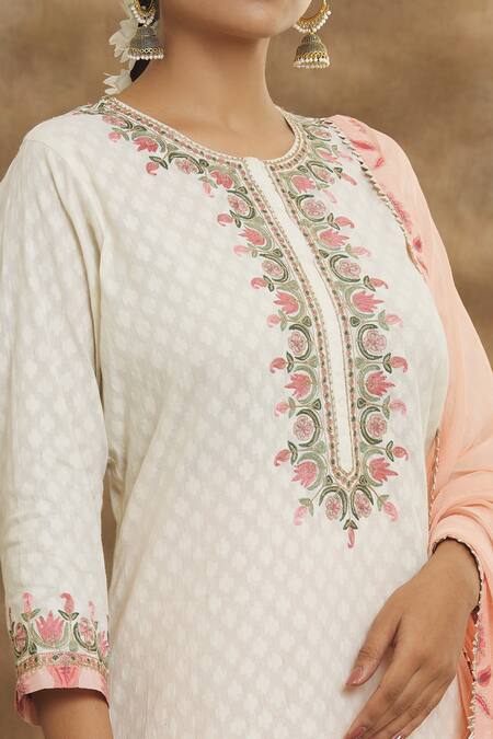 Off White Cotton Embroidery Round Neck Zari Straight Kurta Set