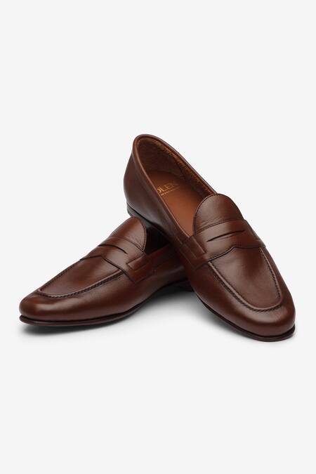 Brown loafers with cutwork strap detail, stack heels & almond toe.