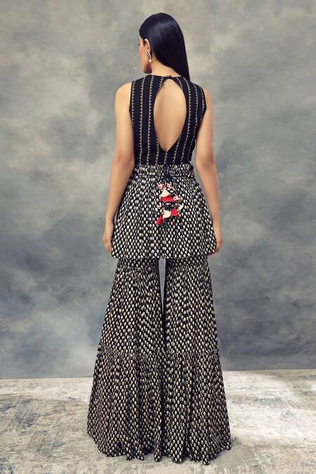 Black short peplum- kurta with gathered flare, all-over printed motif & cutout back. Comes with tiered sharara pants, tassel dupatta & pearl embroidered belt.