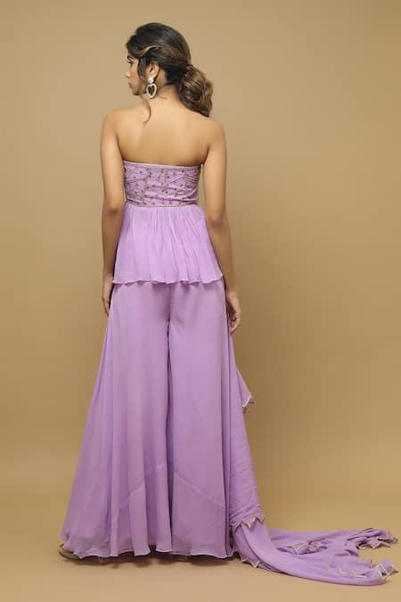 Lilac peplum top with zardozi, zari, moti, cutdana embroidery. Paired with palazzo & dupatta.