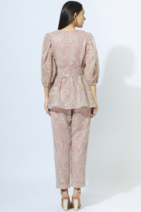 Pink peplum-top with all-over sequin work. Comes with straight pants.