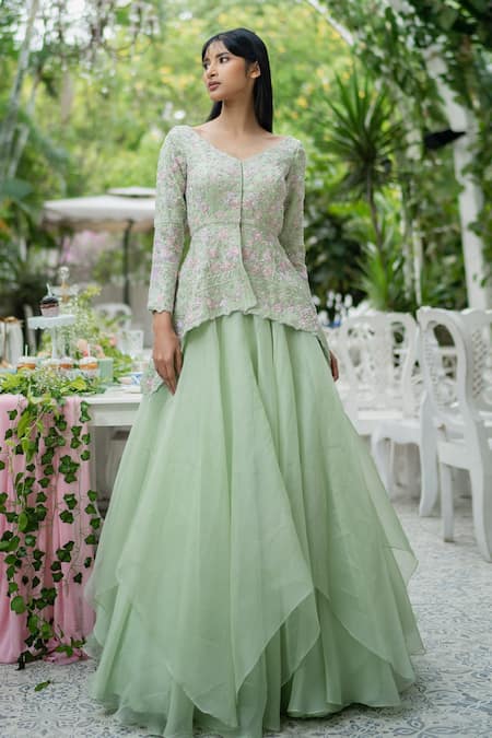 Green Silk Organza Bugle Beads V Neck Peplum Top And Skirt Set