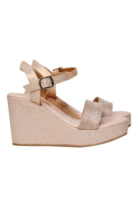 Rose gold wedge sandals featuring an open toe and adjustable ankle strap