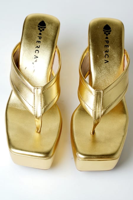 Gold wedges featuring a split toe strap and square toe shape