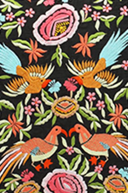 Black Parsi-style square cushion cover with floral embroidered motifs. Comes with filler.