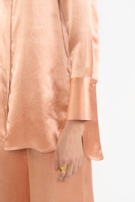 Orange solid shirt featuring full sleeves, collared neckline, and a front button placket