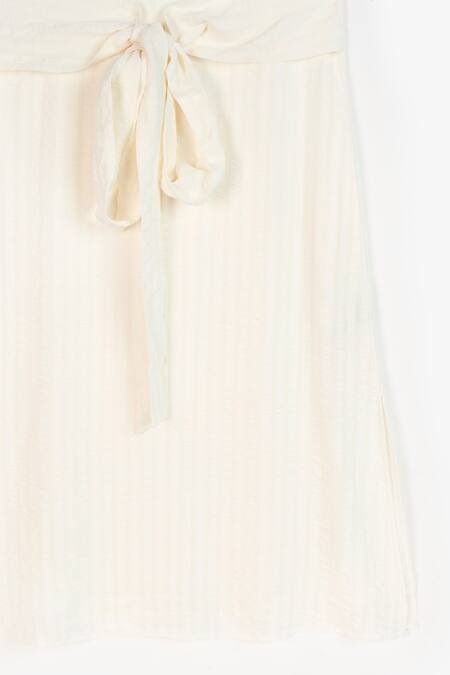 White midi dress featuring stripe detailing all over and an attached belt. It has a V neck and three fourth sleeves with a side slit for added style.