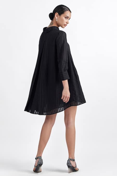 Black A-line dress featuring a front buttoned half placket, striped pattern, and side pockets