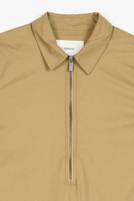 Olive green solid short dress featuring a collared neckline, half sleeves, and a front zipper closure