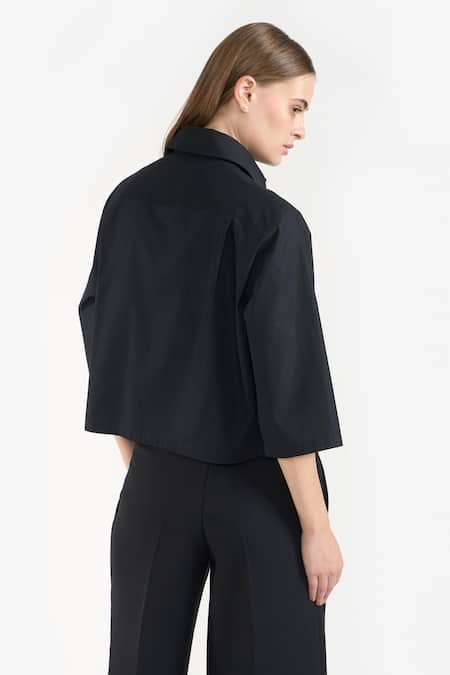 Black cropped shirt featuring a collared neck and dolman sleeves