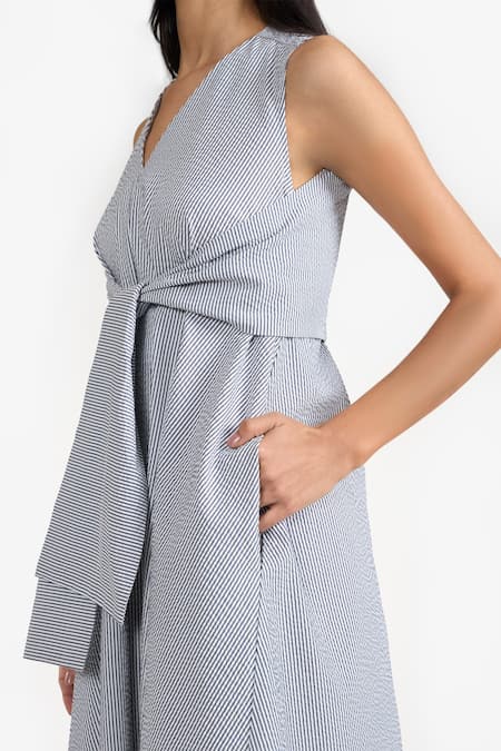 Blue Cotton Stripe V Neck Pattern Belted Dress