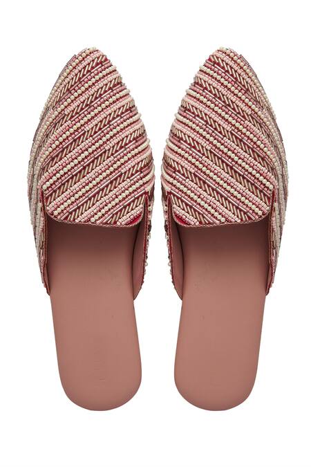Rose gold embellished mules featuring bugle, beads, and pearl detailing