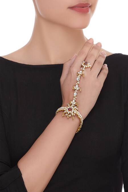Gold petal hand harness bracelet featuring handcrafted floral motifs adorned with kundan and baby pearls