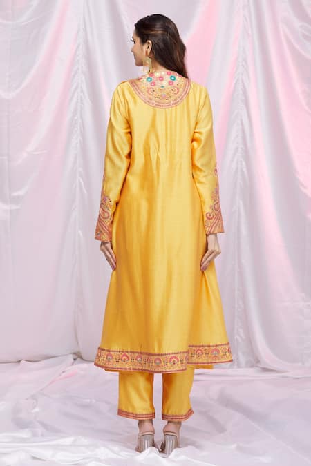 Yellow floral embroidered kurta with mirror work detailing. Paired with pant & dupatta.