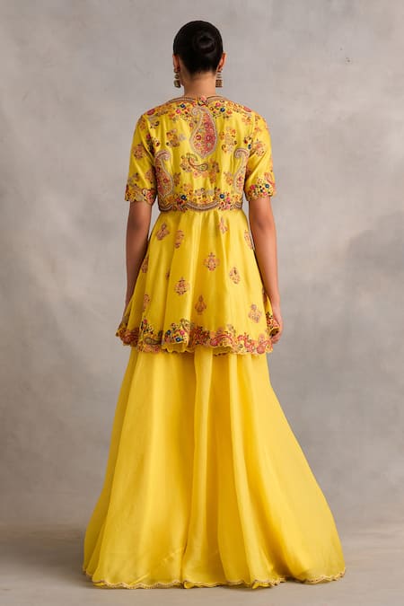 Yellow peplum kurta featuring floral and paisley vine thread embroidery, embellished with sequins and pearls. Paired with a matching flared pant.
