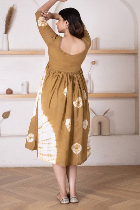 Light brown cotton dress with bandhej tie dye patterns.