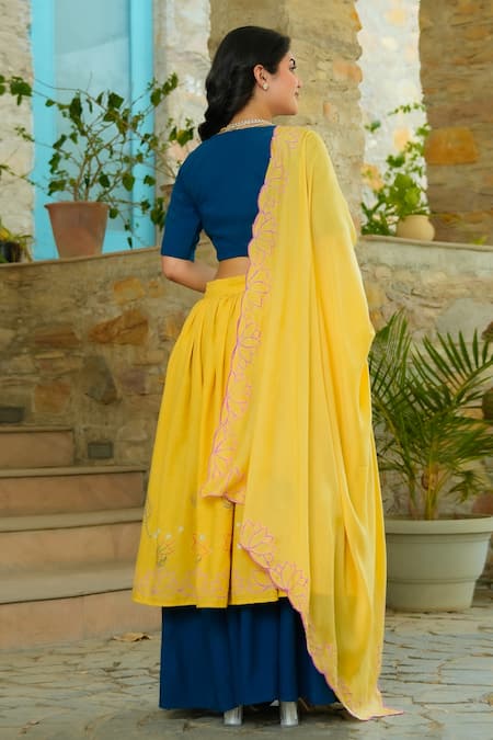 Mustard lehenga featuring hand painted peacock feather, lotus & star motifs. Paired with a solid indigo blouse and a mustard dupatta with scalloped lotus border.