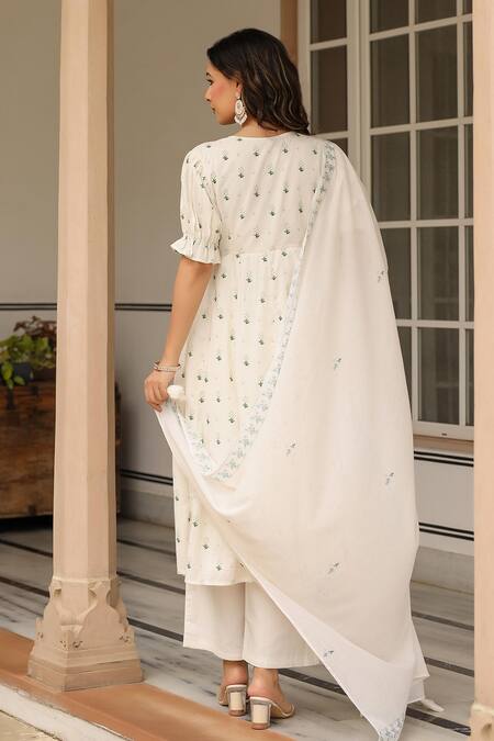 White gathered yoke kurta featuring floral print and puff sleeves. Paired with coordinating pant and dupatta.