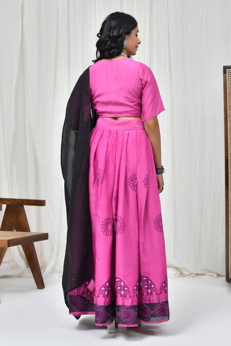 Pink lehenga featuring floral and geometric printed motifs. Paired with a matching blouse and organza dupatta.