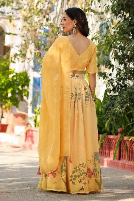 Gold Blouse Muslin Digital Print Floral V Neck Sanjh Lehenga Set