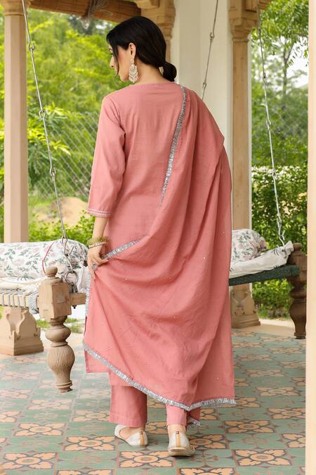 Pink Mulmul Embroidery Fringe Lace Notched Solid Yoke Kurta And Pant Set