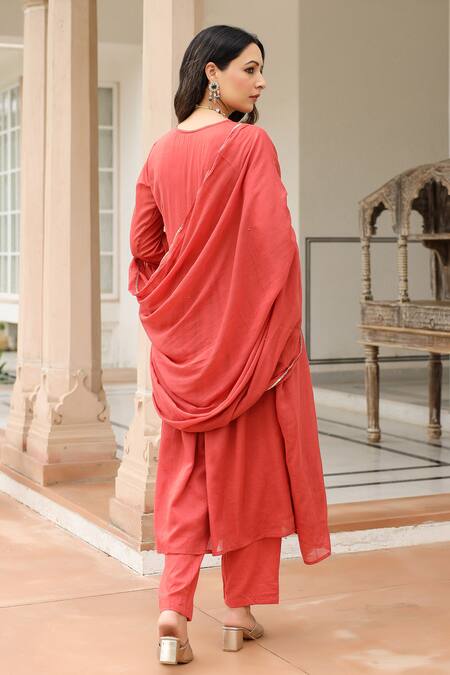 Red Mulmul Embroidery Fringe Lace V-neck Solid Yoke Gathered Anarkali And Pant Set