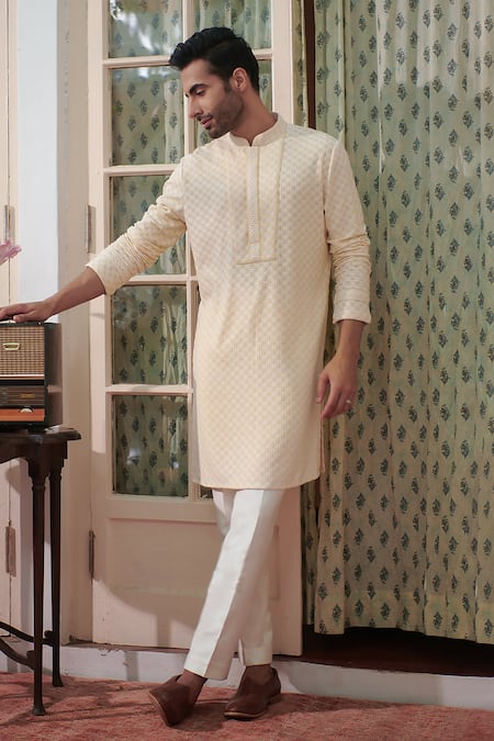 Yellow silk kurta featuring thread embroidery and a mandarin collar