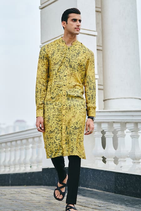 Yellow cotton kurta featuring full sleeves and a mandarin collar
